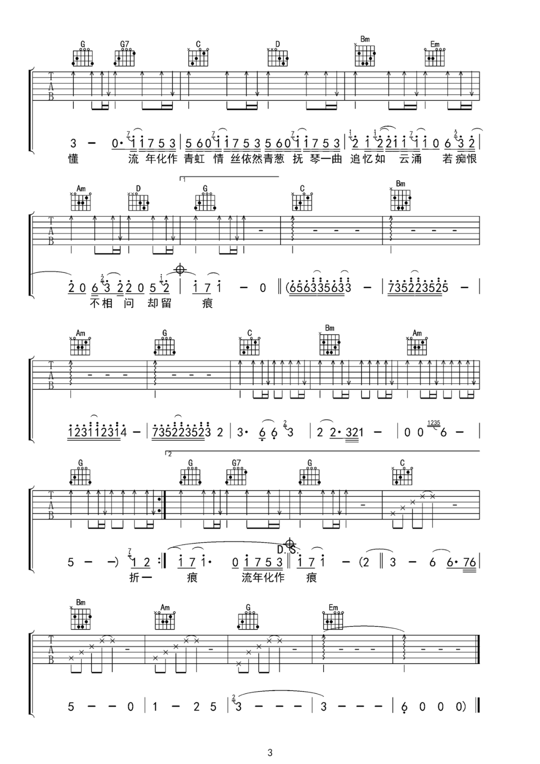 曲谱介绍: 等什么君演唱的一首歌曲,4/4拍的节奏,这首歌曲的原调为A调,这里曲谱采用了G调指法进行编配,演唱时夹变调夹2品可回到原调,也可根据个人实际嗓音情况选择。曲谱由琴谱网更新上传,曲谱来源于网络转载,编配制谱者暂不详。这首歌太好听了,真的扣人心弦,让人赞叹不已,燕语莺声,等什么君的声音仿佛还原了歌曲中深情的故事,令人悲叹。