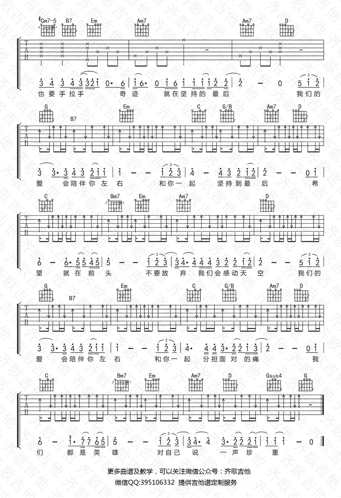 曲谱介绍: 胡彦斌演唱的一首歌曲,4/4拍的节奏,这首歌曲的原调为降B调,这里曲谱采用了G调指法进行编配,演唱时夹变调夹3品可回到原调,也可根据个人实际嗓音情况选择。曲谱由琴谱网更新上传,来源于@齐歌吉他编配出品。这首歌是胡彦斌为512四川汶川大地震而作,最初的版本是由萧亚轩和胡彦斌对唱,在公益纪录片《微爱之光》中,胡彦斌翻唱了自己的这首旧作,独唱版听起来似乎比对唱版更浑然一体一些。