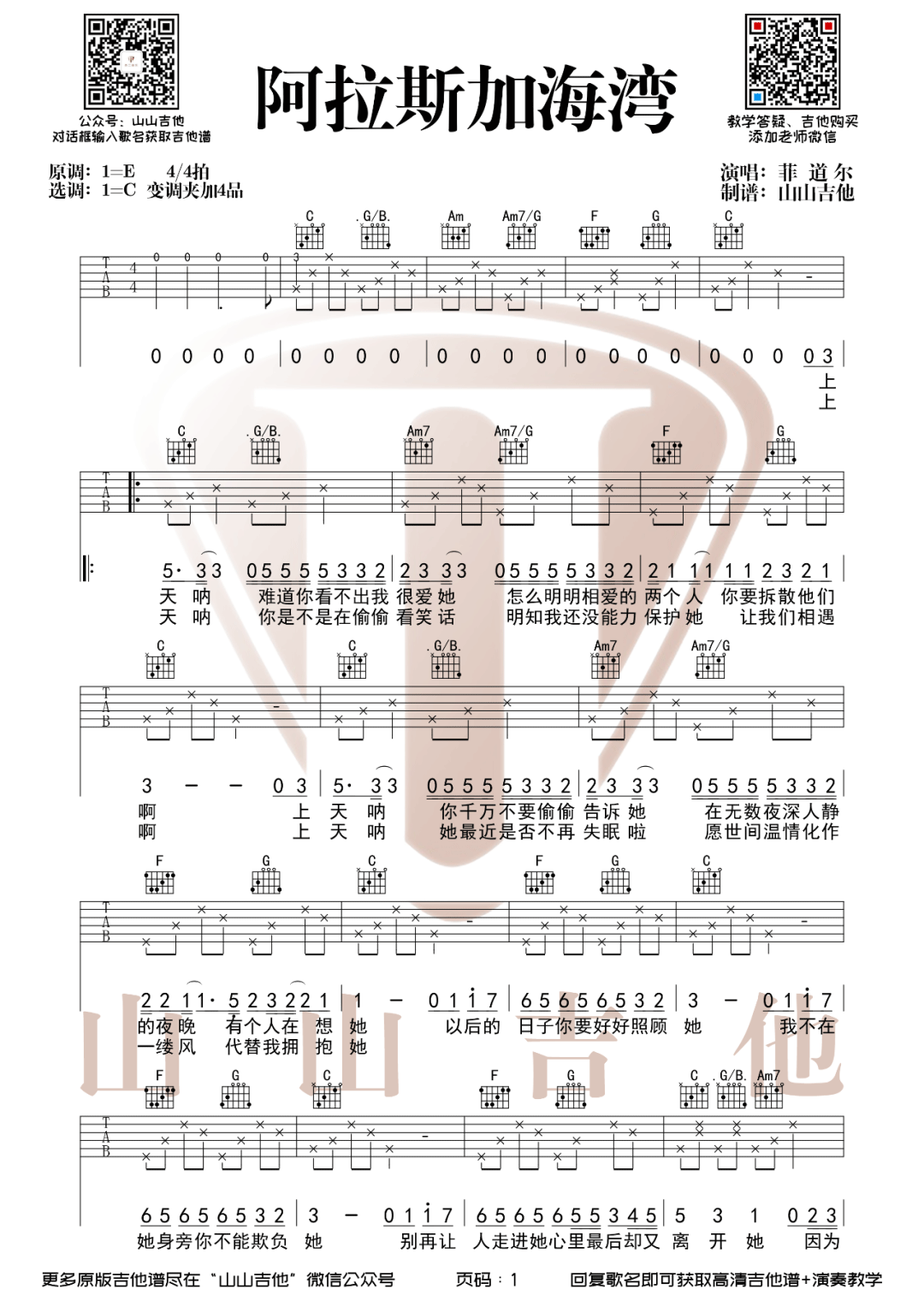 曲谱介绍: 菲道尔演唱的一首歌曲,4/4拍的节奏,这首歌曲的原调为E调,这里曲谱采用了C调指法进行编配,演唱时夹变调夹4品可回到原调,也可根据个人实际嗓音情况选择。曲谱由琴谱网更新上传,来源于@山山吉他编配出品。阿拉斯加海湾是世界九大著名海峡之一,两片海因为密度的原因,不能融为一体,就像两个相爱的人,最终没有在一起。大概这是最让人遗憾的事情了吧,一个正当最美好年华的人,却只能错过她。