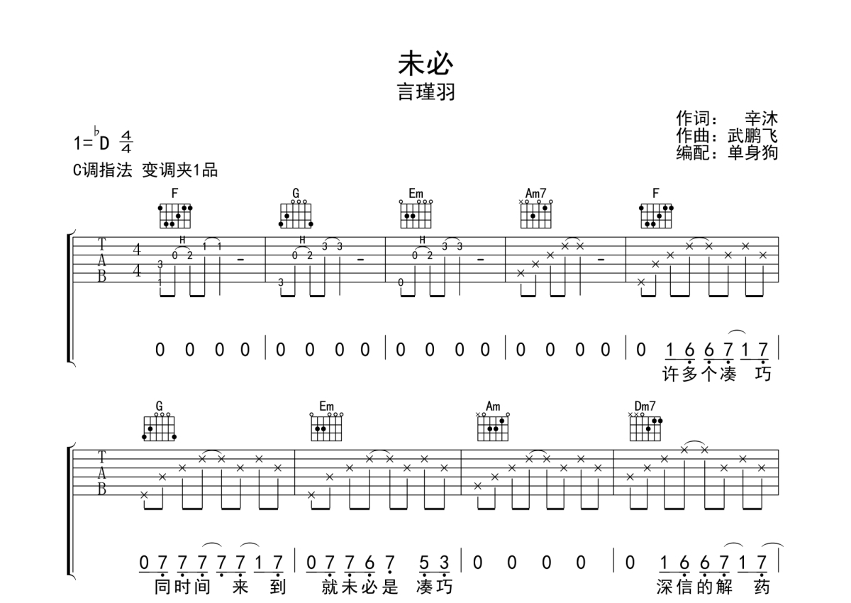 曲谱介绍: 言瑾羽《未必》吉他弹唱谱,采用C调指法编配,单身狗编配出品,共有3张高清图谱。