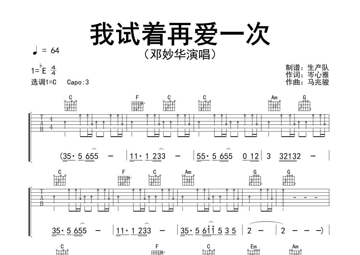 曲谱介绍: 邓妙华《我试着再爱一次》吉他弹唱谱,采用C调指法编配精编民谣版,生产队编配出品,共有2张高清图谱,免翻页排版设计。