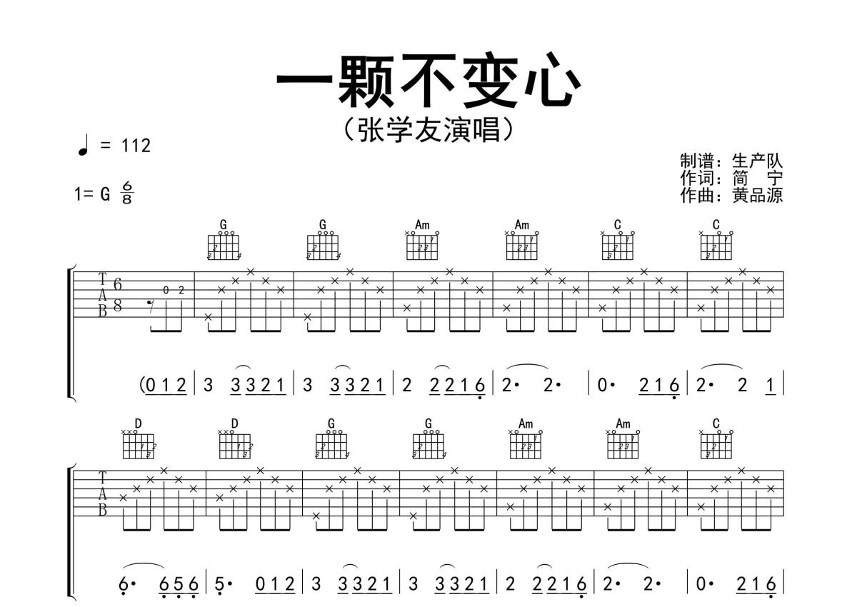 曲谱介绍: 张学友《一颗不变心》吉他弹唱谱,采用G调指法编配精编完美版,生产队编配出品,共有3张高清图谱。