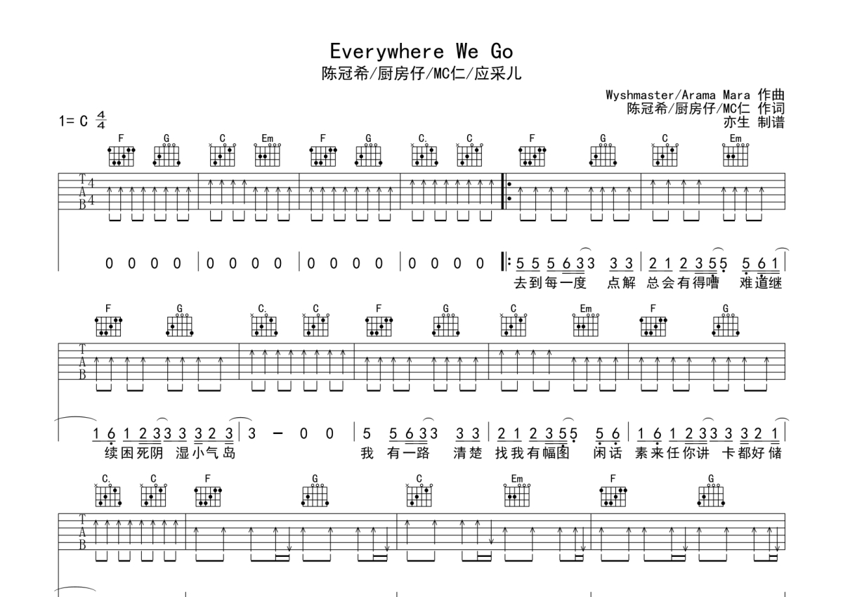 曲谱介绍: 陈冠希/厨房仔/MC仁/应采儿《EverywhereWeGo》吉他弹唱谱,采用C调指法编配,亦生编配出品,共有3张高清图谱。