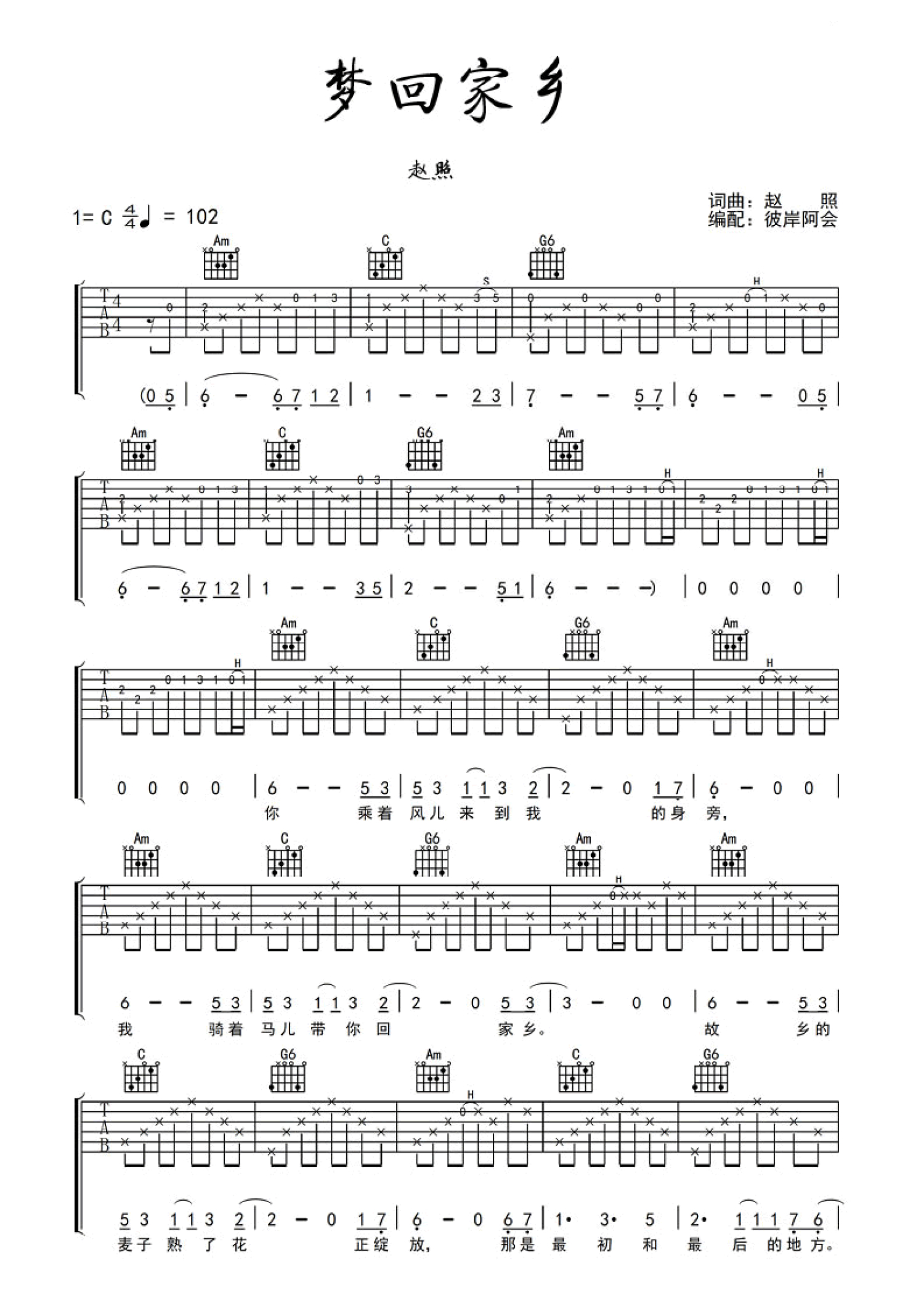 梦回家乡吉他谱 - 赵照 - C调吉他弹唱谱