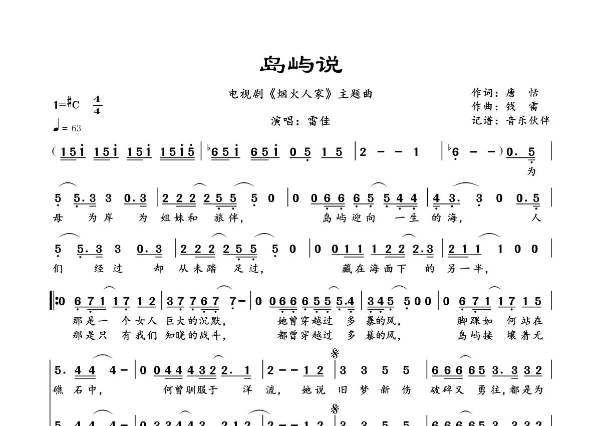 曲谱介绍: 雷佳《岛屿说》,音乐伙伴编配出品,共有1张高清图谱,免翻页排版设计。