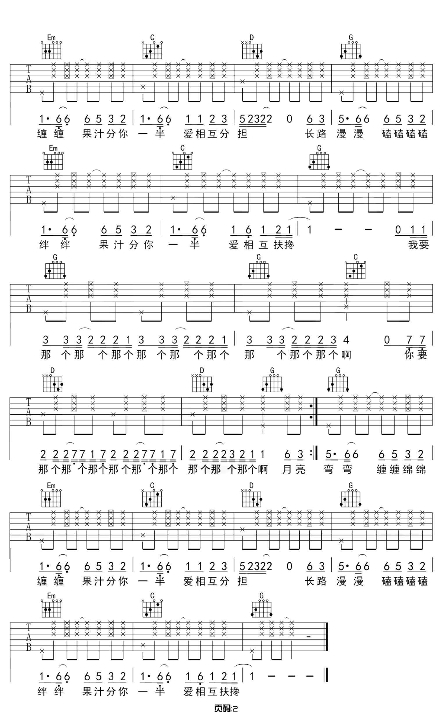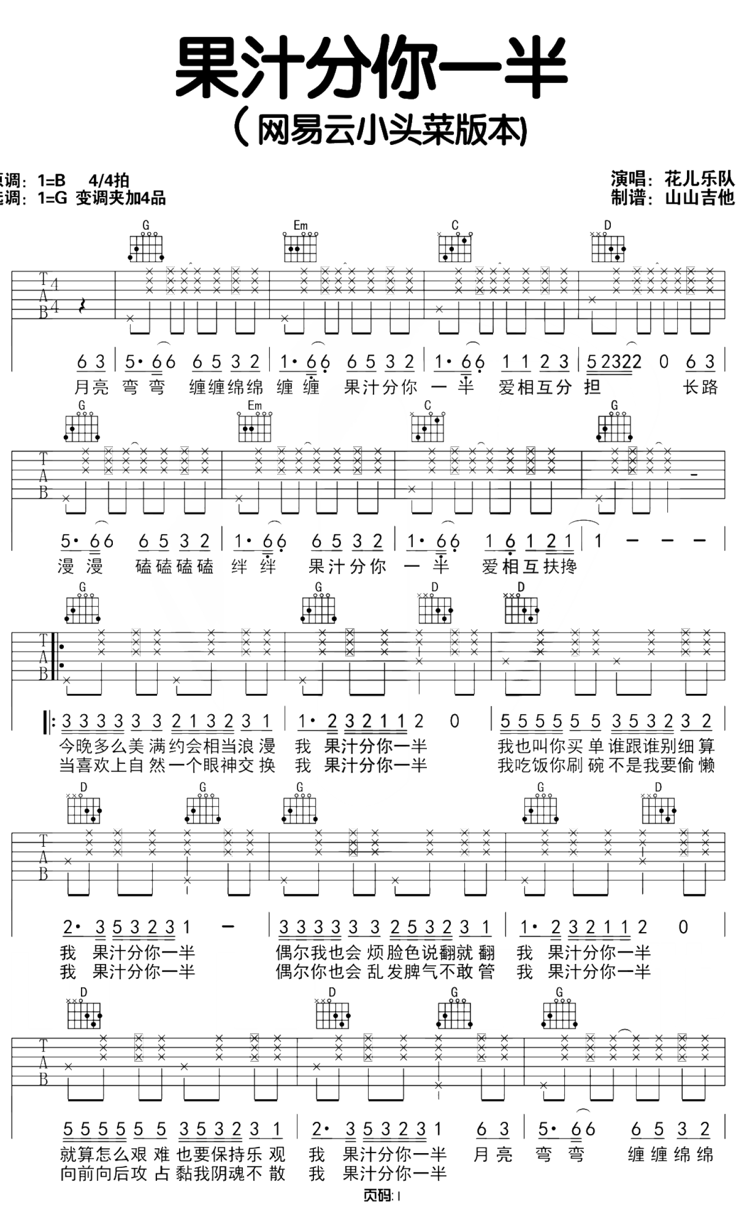 曲谱介绍: 小头菜/花儿乐队《果汁分你一半》吉他谱_G调吉他弹唱谱