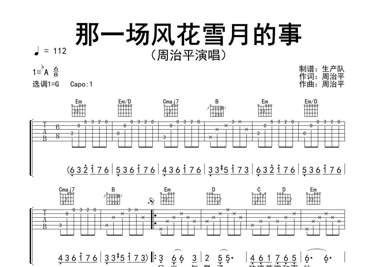 曲谱介绍: 周治平《那一场风花雪月的事》吉他弹唱谱,采用G调指法编配精编完美版,生产队编配出品,共有3张高清图谱。