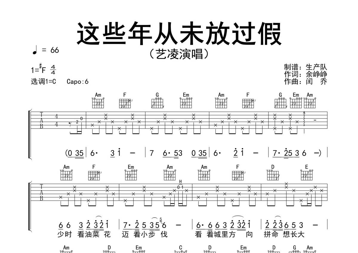 曲谱介绍: 艺凌《这些年从未放过假》吉他弹唱谱,采用C调指法编配精编完美版,生产队编配出品,共有2张高清图谱,免翻页排版设计。