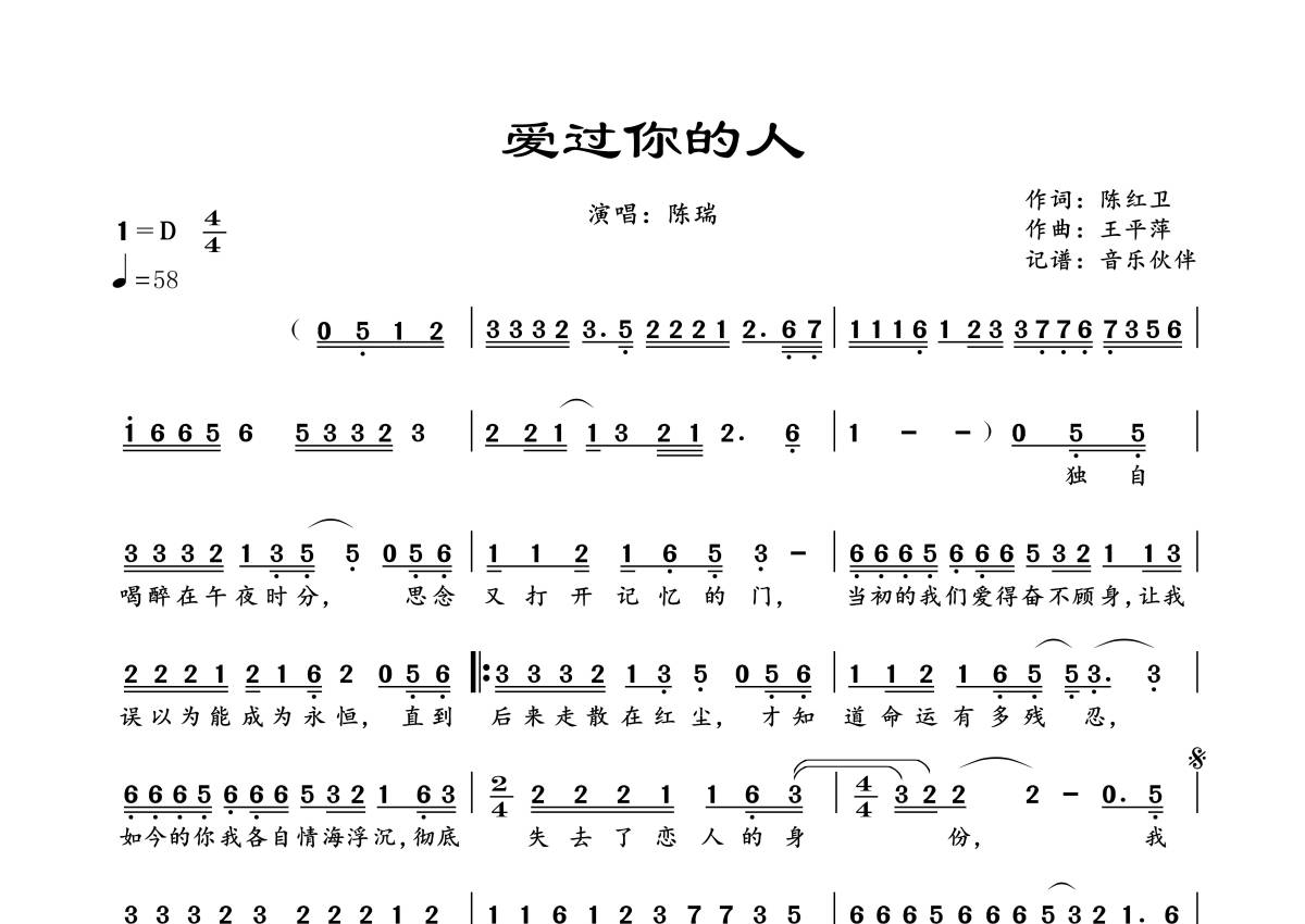 曲谱介绍: 陈瑞《爱过你的人》,音乐伙伴编配出品,共有1张高清图谱,免翻页排版设计。