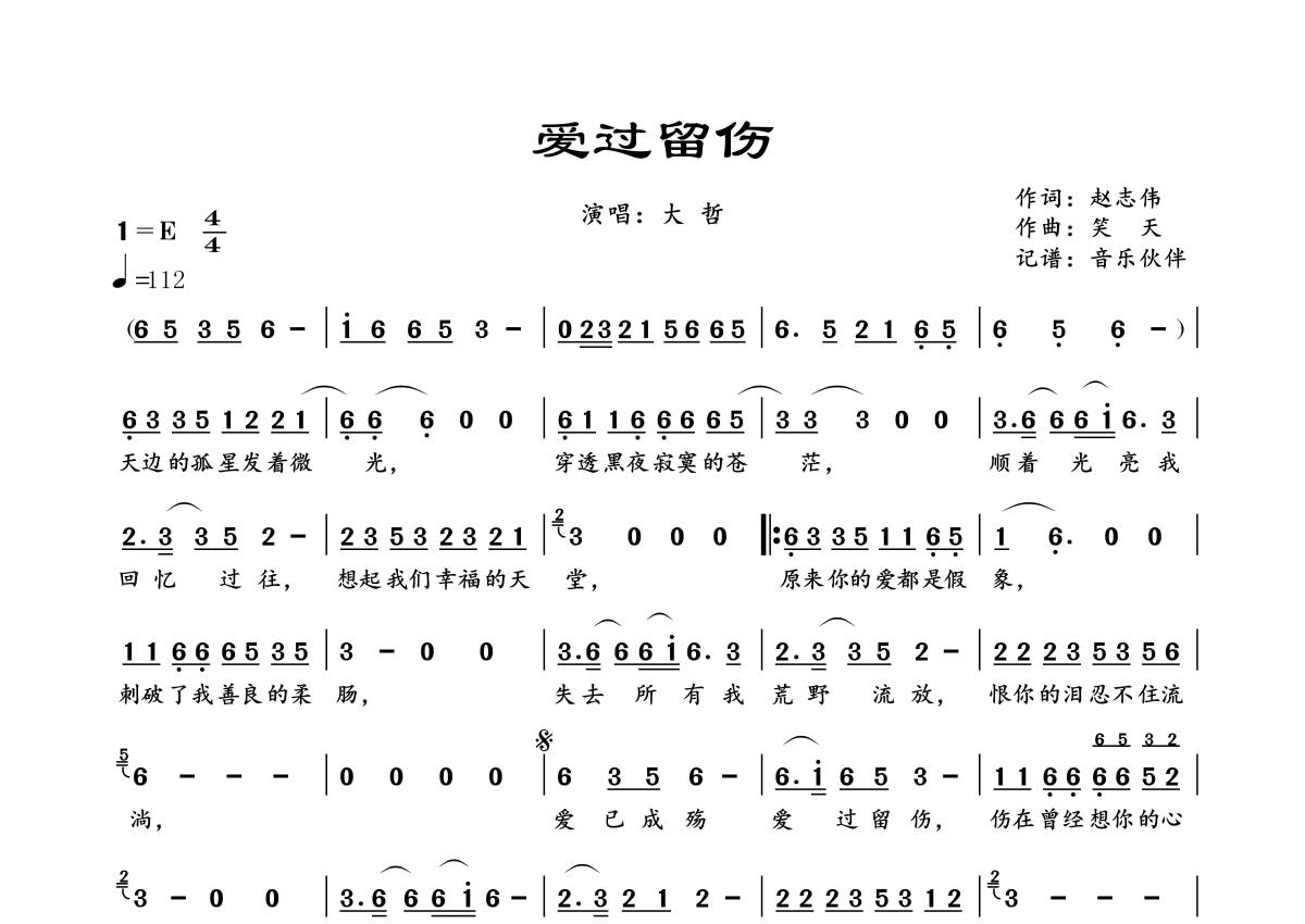 曲谱介绍: 大哲《爱过留伤》,音乐伙伴编配出品,共有1张高清图谱,免翻页排版设计。