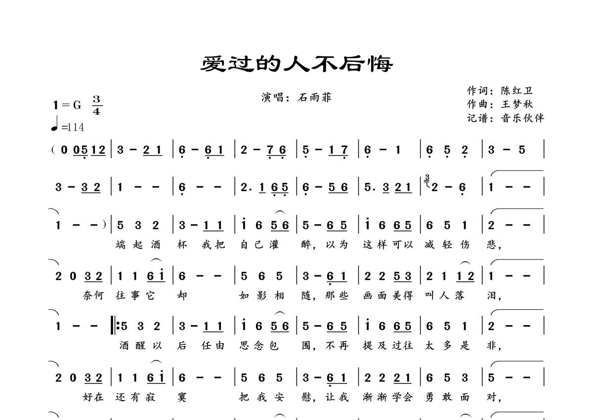 曲谱介绍: 石雨菲《爱过的人不后悔》,音乐伙伴编配出品,共有1张高清图谱,免翻页排版设计。