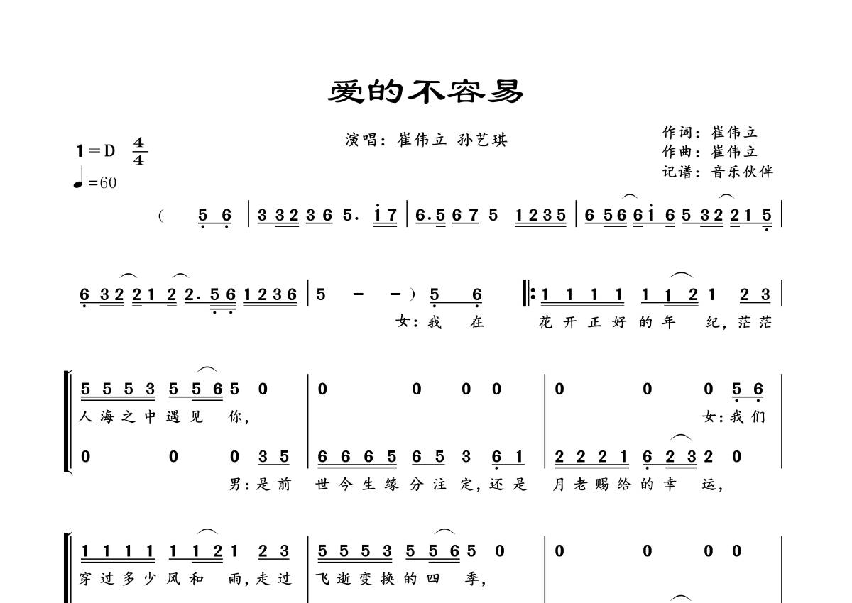 曲谱介绍: 崔伟立/孙艺琪《爱的不容易》,音乐伙伴编配出品,共有2张高清图谱,免翻页排版设计。