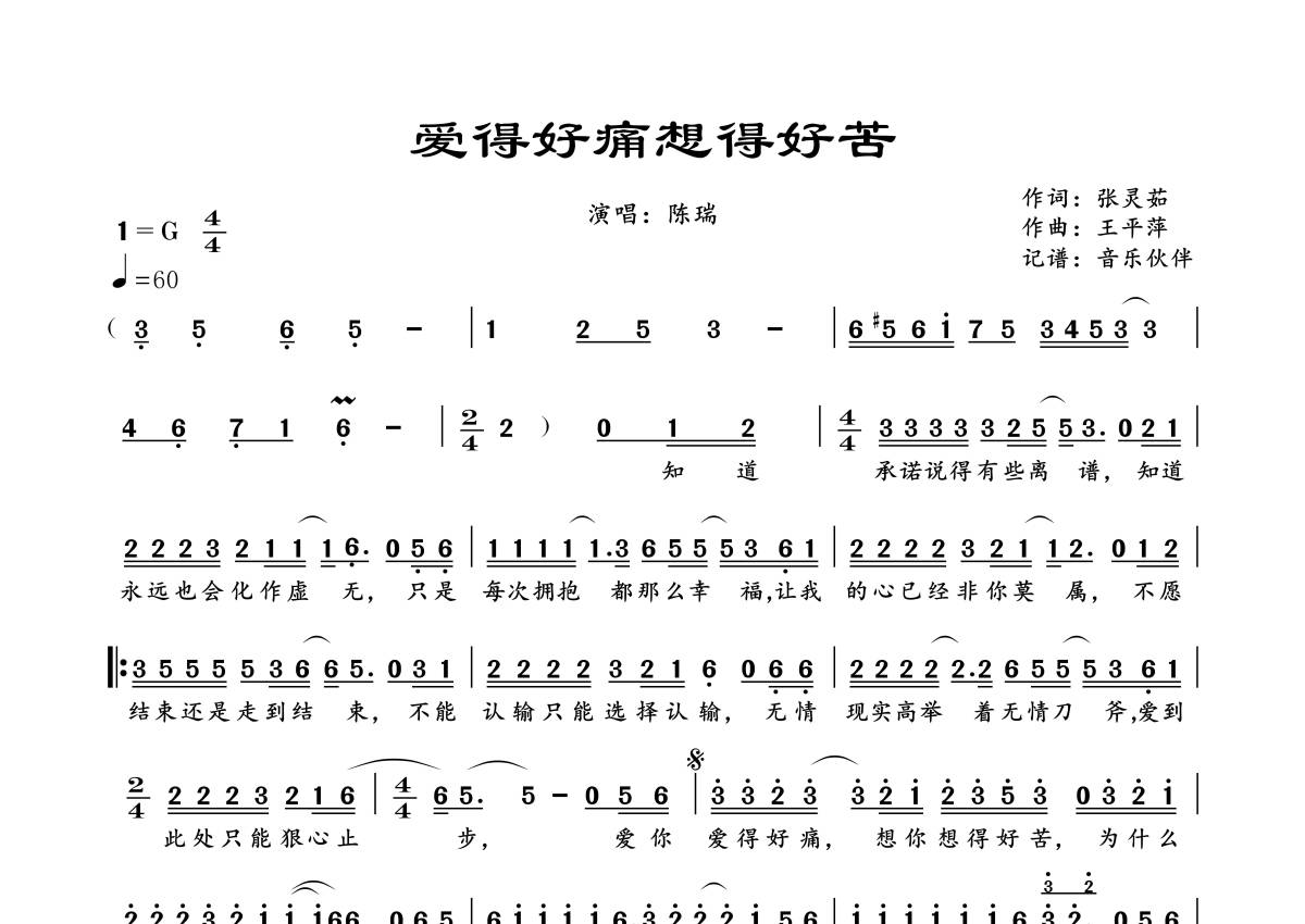 曲谱介绍: 陈瑞《爱得好痛想得好苦》,音乐伙伴编配出品,共有1张高清图谱,免翻页排版设计。