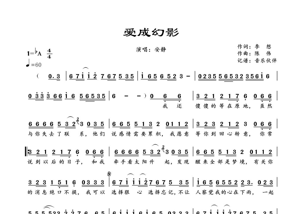 曲谱介绍: 安静《爱成幻影》,音乐伙伴编配出品,共有1张高清图谱,免翻页排版设计。