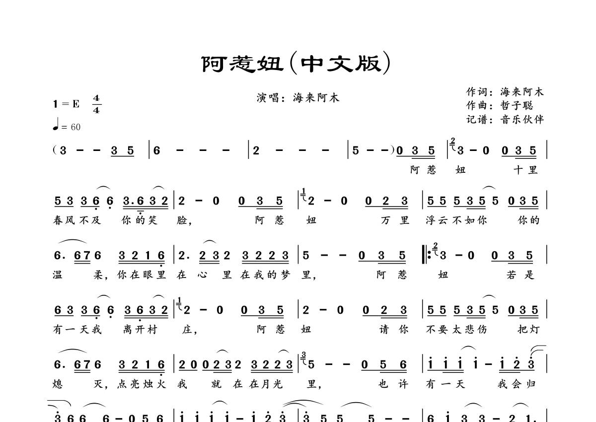 曲谱介绍: 海来阿木《阿惹妞》中文版,音乐伙伴编配出品,共有1张高清图谱,免翻页排版设计。