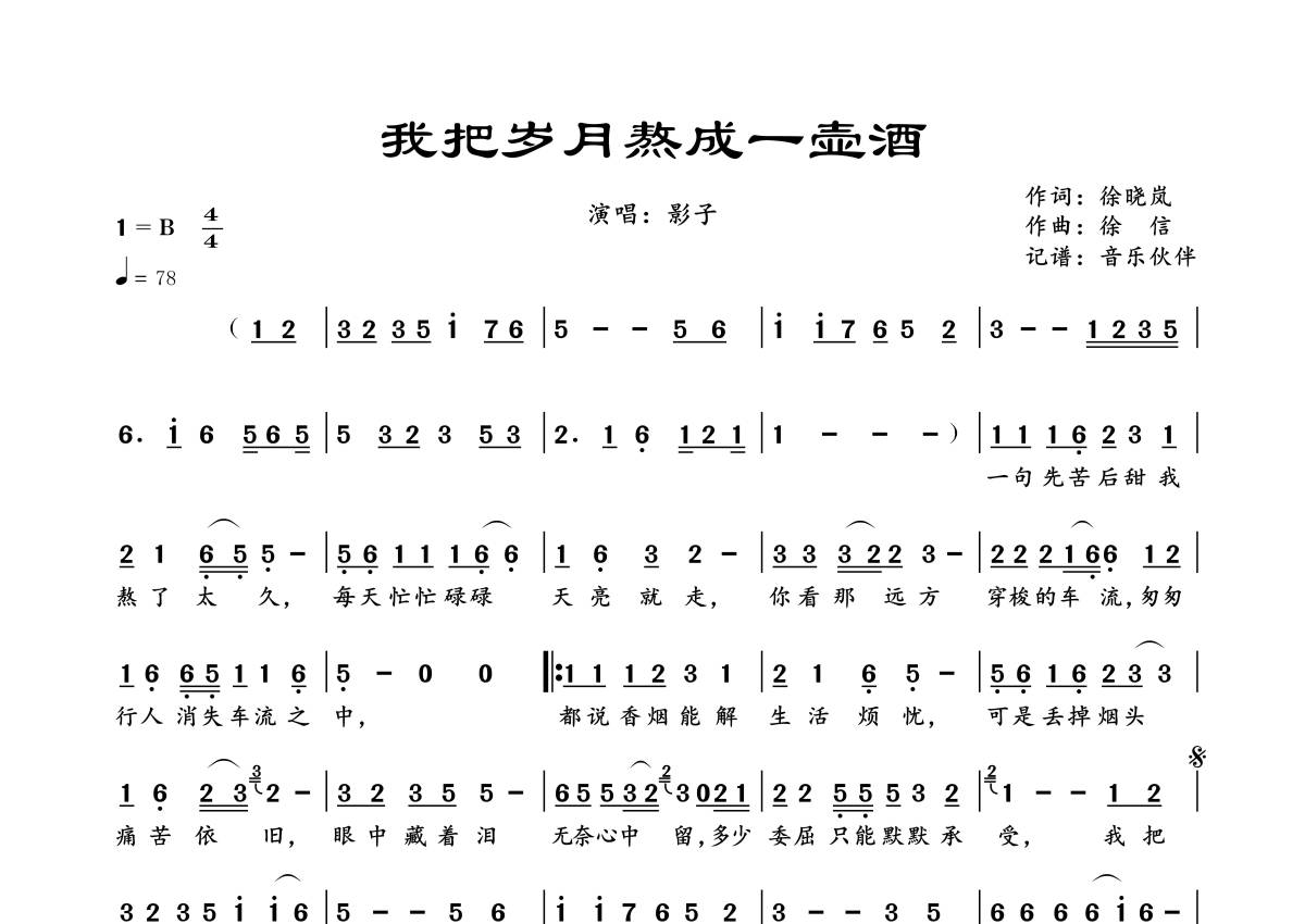 曲谱介绍: 影子《我把岁月熬成一壶酒》,音乐伙伴编配出品,共有1张高清图谱,免翻页排版设计。