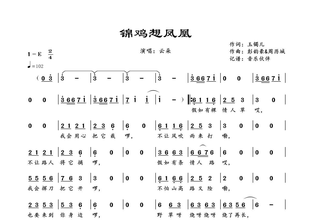 曲谱介绍: 云朵《锦鸡想凤凰》,音乐伙伴编配出品,共有1张高清图谱,免翻页排版设计。