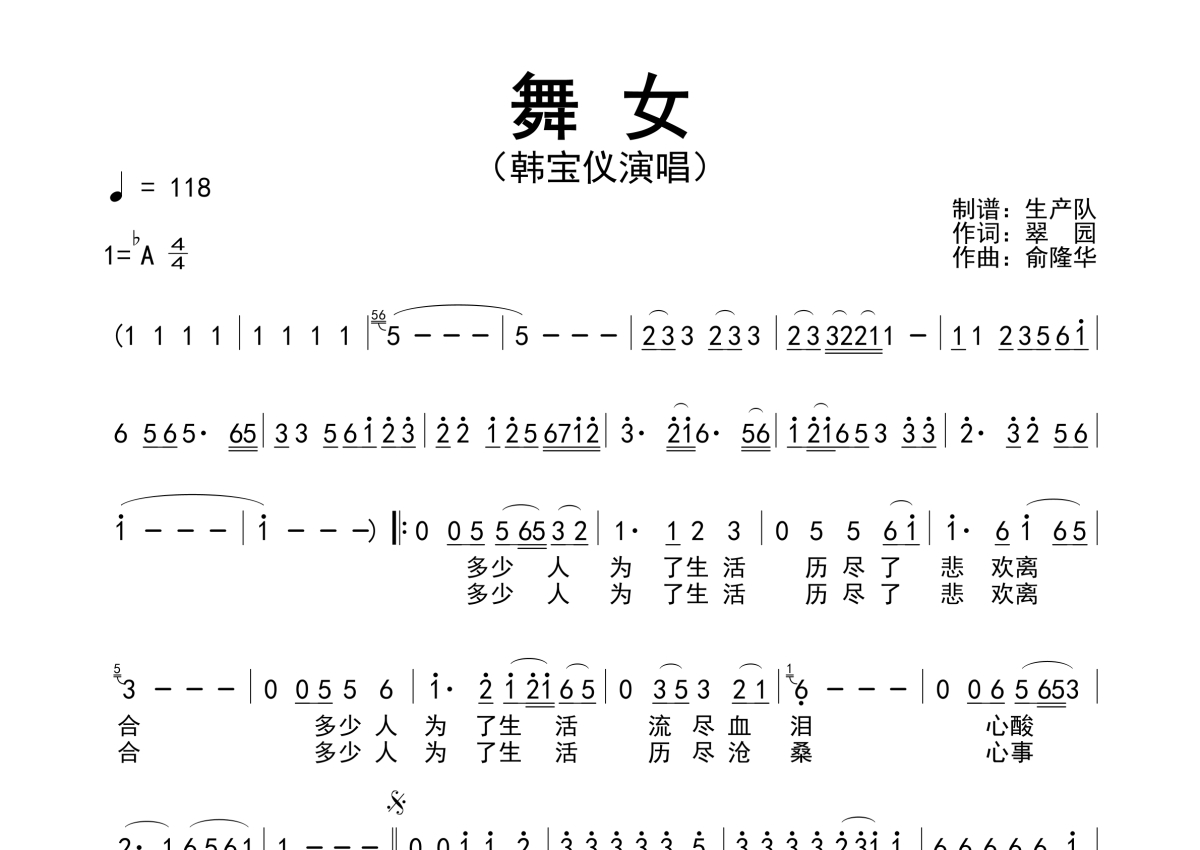 曲谱介绍: 韩宝仪《舞女》简谱,生产队编配出品,共有1张高清图谱,免翻页排版设计。