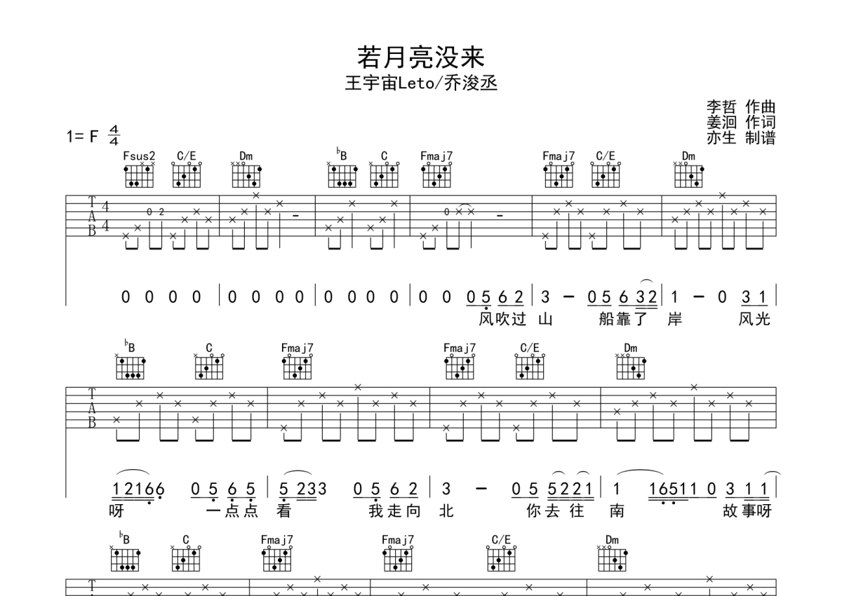 曲谱介绍: 王宇宙/乔浚丞《若月亮没来》吉他弹唱谱,采用F调指法编配,亦生编配出品,共有3张高清图谱。
