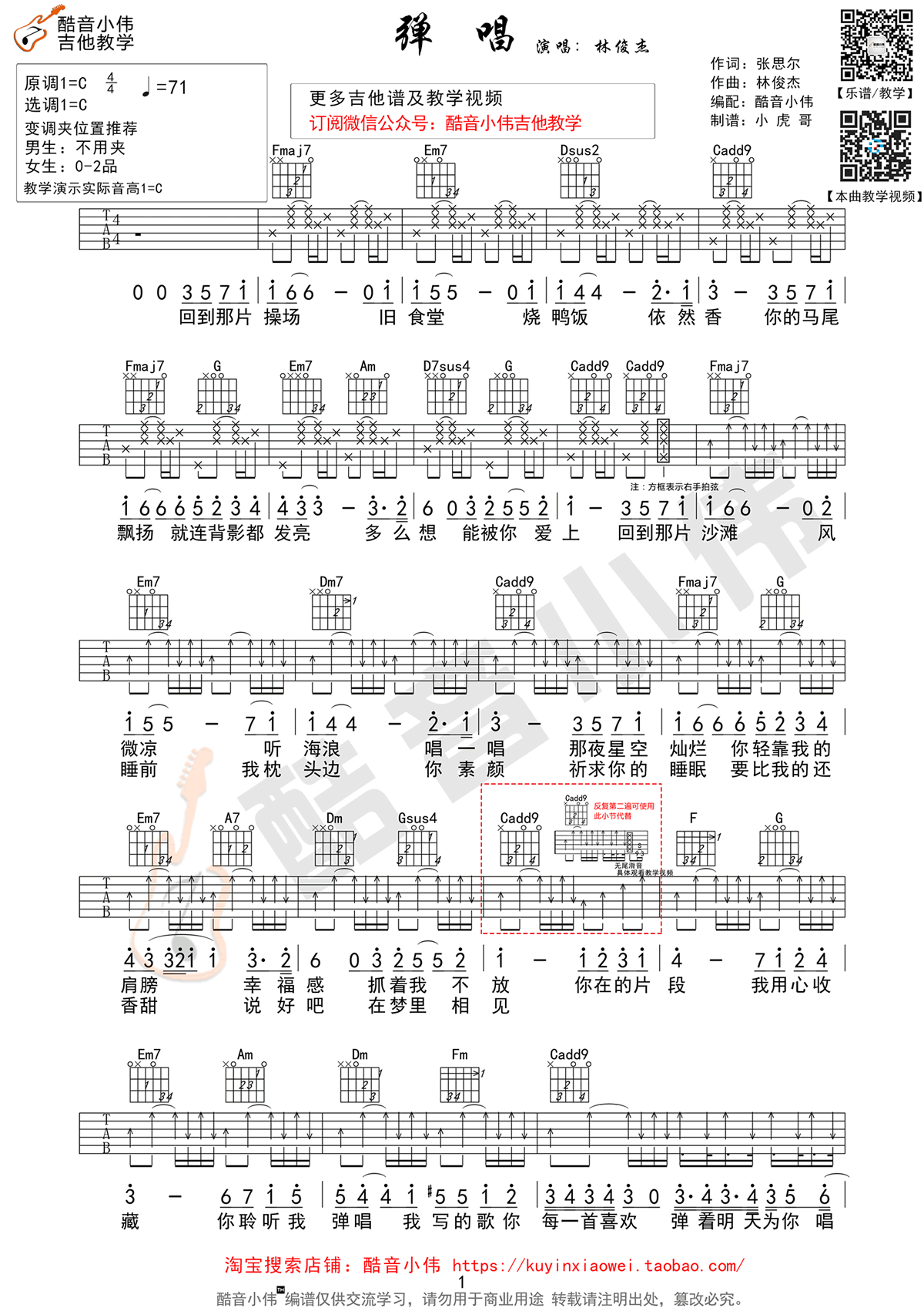 曲谱介绍: 林俊杰演唱的《弹唱》吉他谱,C调高清弹唱谱,变调夹男生不用,女生建议0-2品。林俊杰首张实验专辑《和自己对话》里面的一首歌曲,弹唱六线谱,酷音小伟老师编配。 很治愈的《弹唱》,暖暖的歌词让人嘴角不禁上扬。清新的情歌,令人身心愉悦,适合唱给爱的人听。