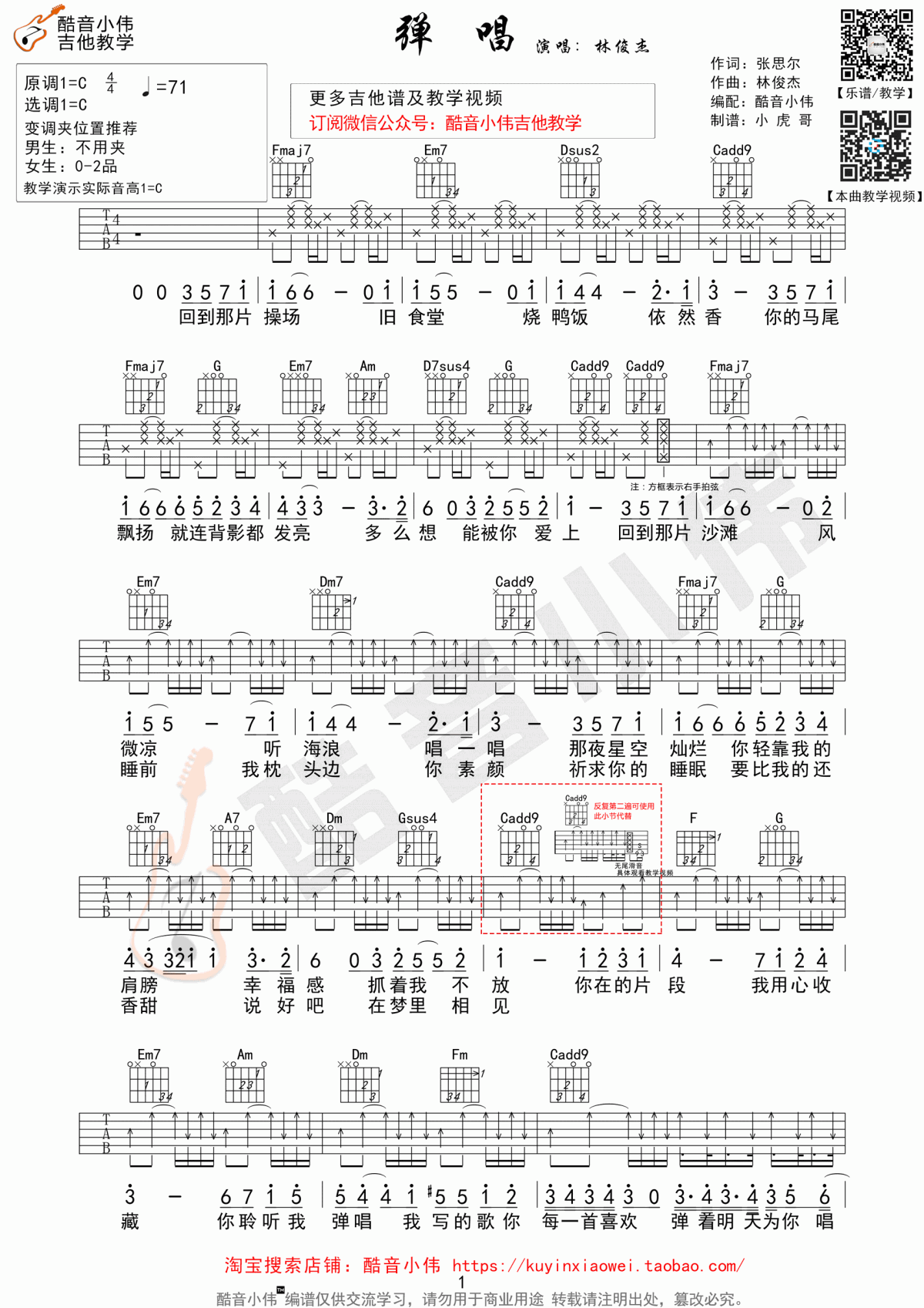 曲谱介绍: 林俊杰《弹唱》吉他弹唱谱,采用C调指法编配,共有2张高清图谱,免翻页排版设计。