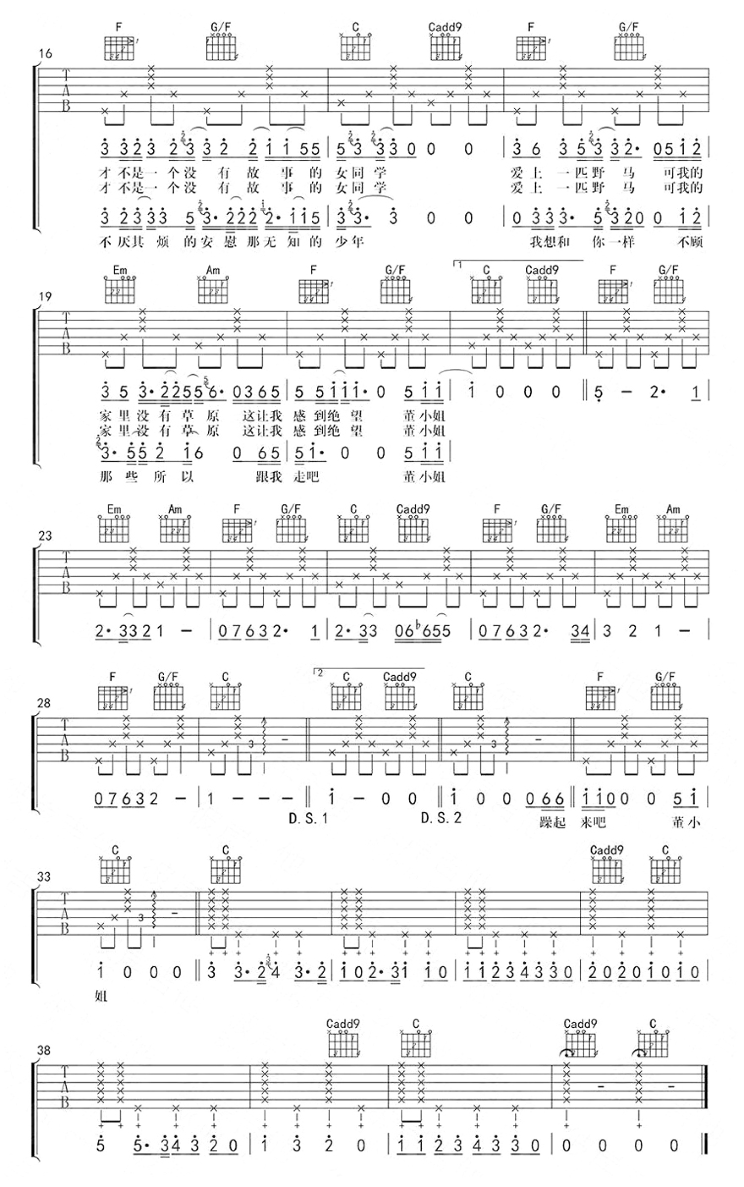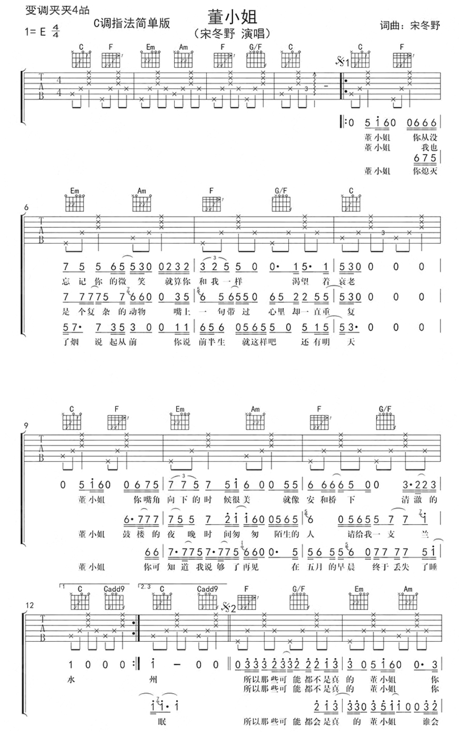 董小姐吉他谱 - 宋冬野 - C调吉他弹唱谱