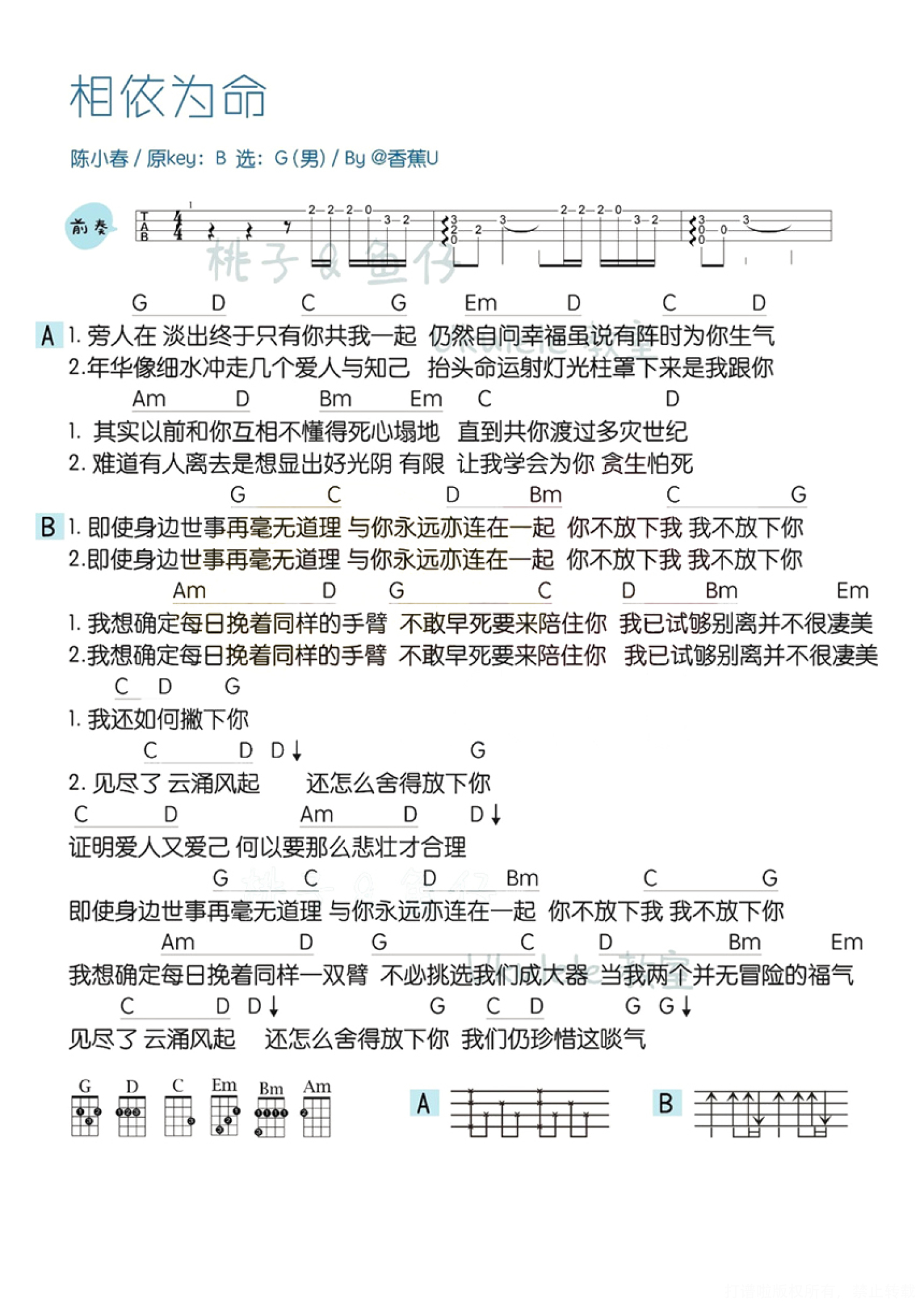 曲谱介绍: 陈小春《相依为命》尤克里里谱,原调B,本曲谱分两个编配版本,分别是C调女生版和G调男生版。