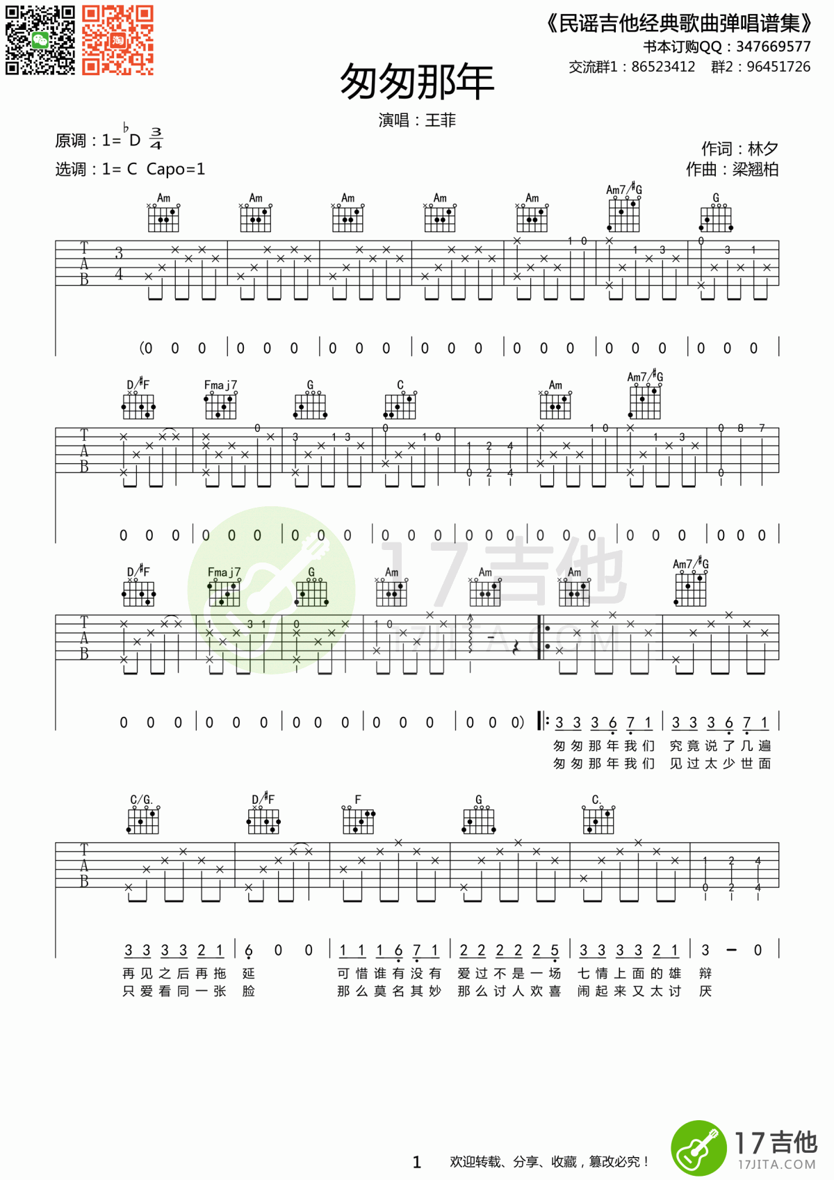 曲谱介绍: 王菲《匆匆那年》吉他弹唱谱,采用C调指法编配,共有3张高清图谱。