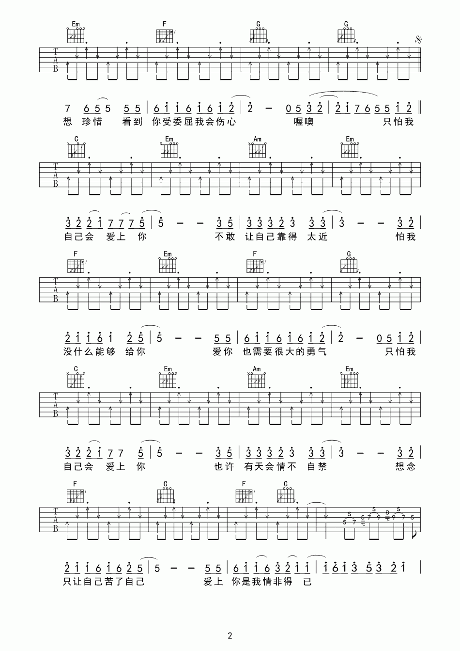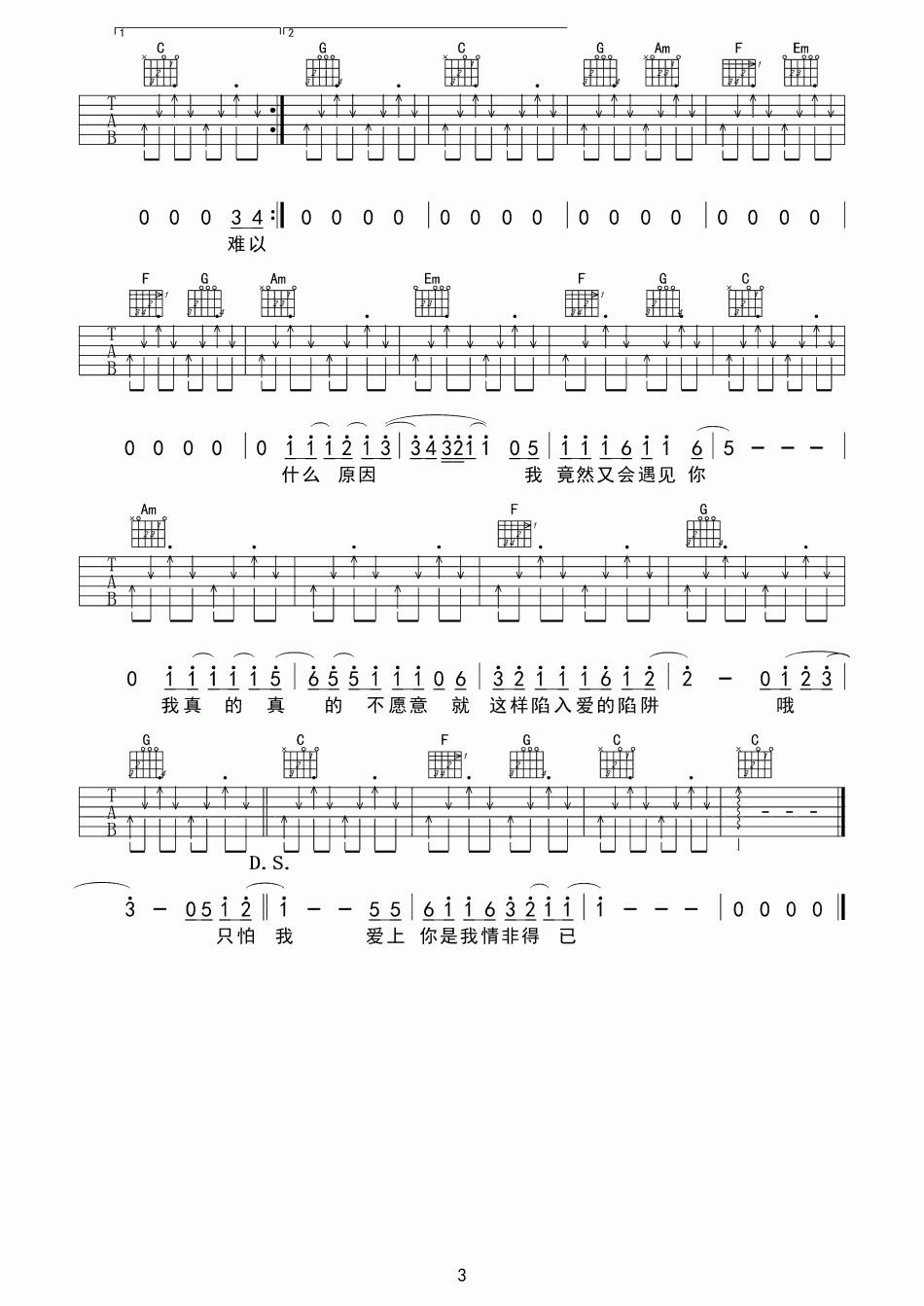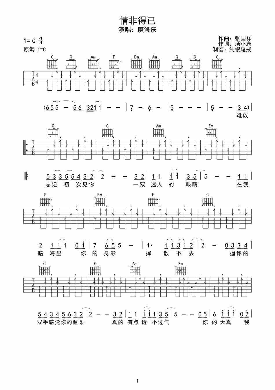 曲谱介绍: 庾澄庆《情非得已》吉他弹唱谱,采用C调指法编配,共有3张高清图谱。