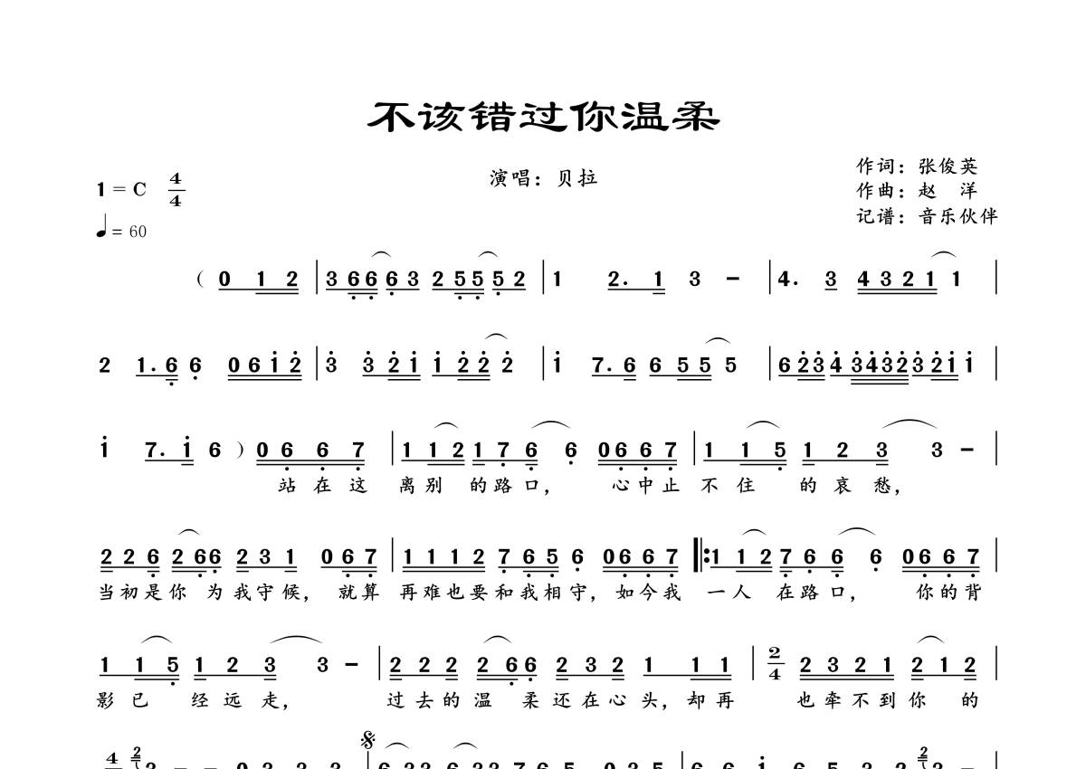 曲谱介绍: 贝拉《不该错过你温柔》,音乐伙伴编配出品,共有1张高清图谱,免翻页排版设计。