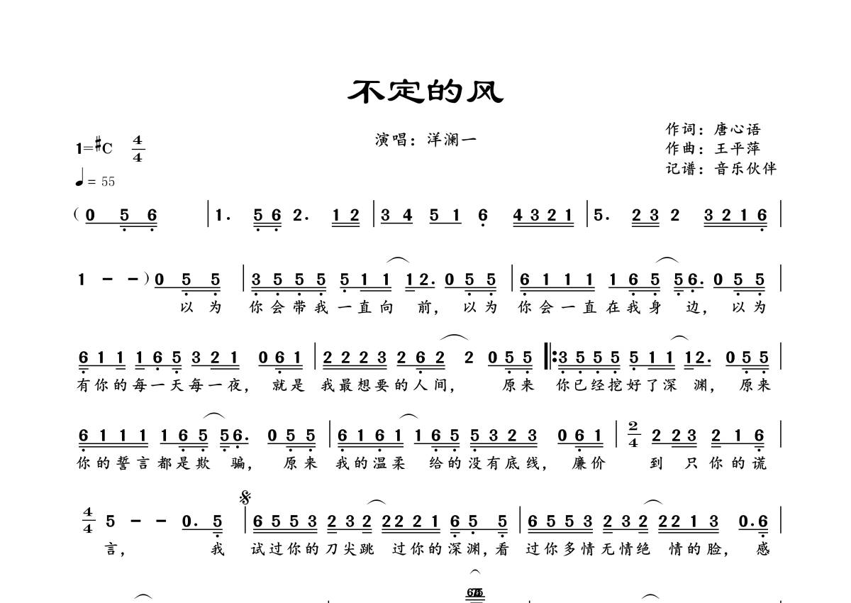 曲谱介绍: 洋澜一《不定的风》,音乐伙伴编配出品,共有1张高清图谱,免翻页排版设计。