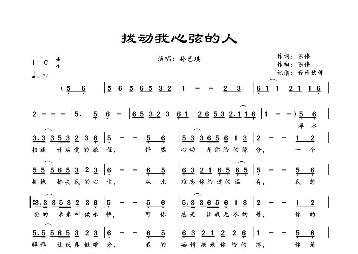曲谱介绍: 孙艺琪《拨动我心弦的人》,音乐伙伴编配出品,共有1张高清图谱,免翻页排版设计。