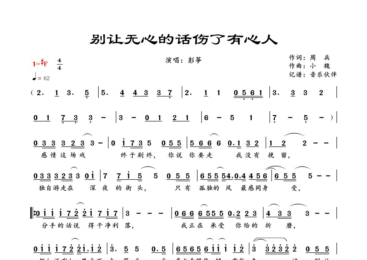 曲谱介绍: 彭筝《别让无心的话伤了有心人》,音乐伙伴编配出品,共有1张高清图谱,免翻页排版设计。