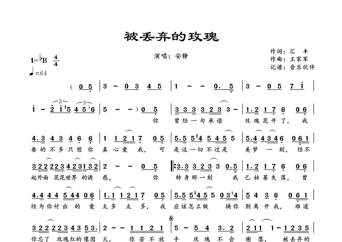 曲谱介绍: 安静《被丢弃的玫瑰》,音乐伙伴编配出品,共有1张高清图谱,免翻页排版设计。