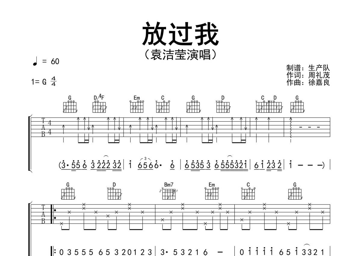 曲谱介绍: 袁洁莹《放过我》吉他弹唱谱,采用G调指法编配精编完美版,生产队编配出品,共有3张高清图谱。