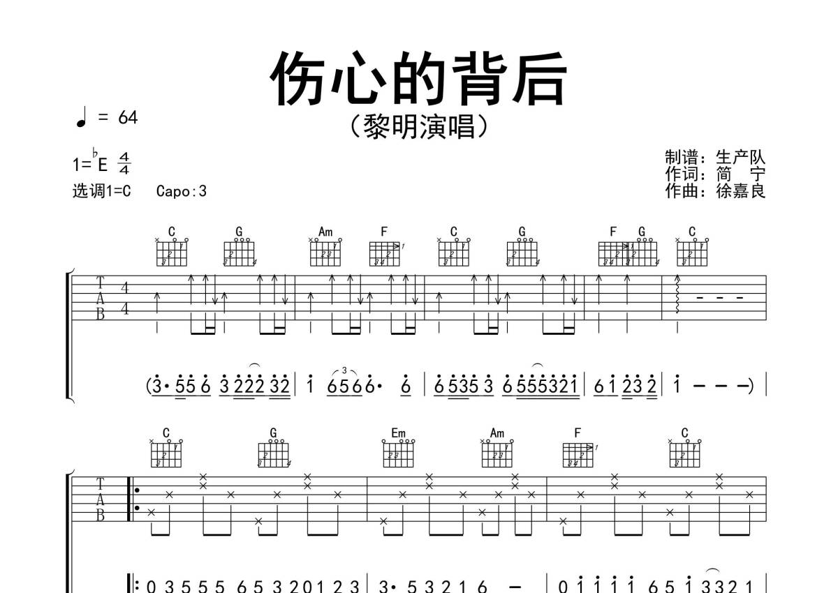 曲谱介绍: 黎明《伤心的背后》吉他弹唱谱,采用C调指法编配精编完美版,生产队编配出品,共有3张高清图谱。