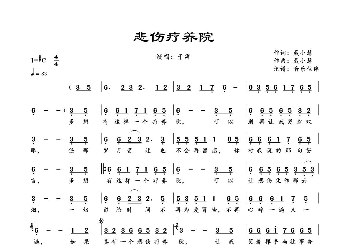 曲谱介绍: 于洋《悲伤疗养院》,音乐伙伴编配出品,共有1张高清图谱,免翻页排版设计。