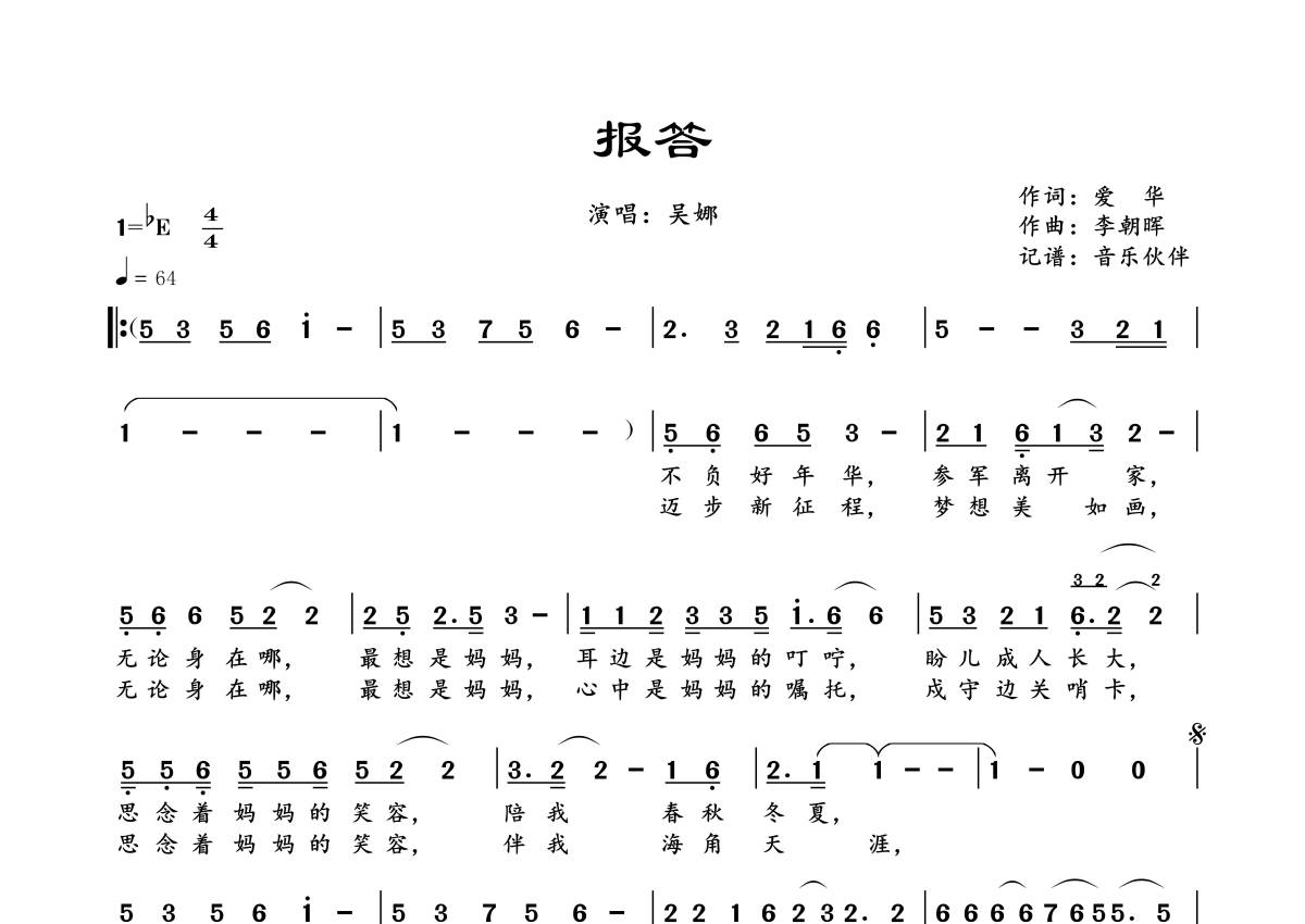 曲谱介绍: 吴娜《报答》,音乐伙伴编配出品,共有1张高清图谱,免翻页排版设计。