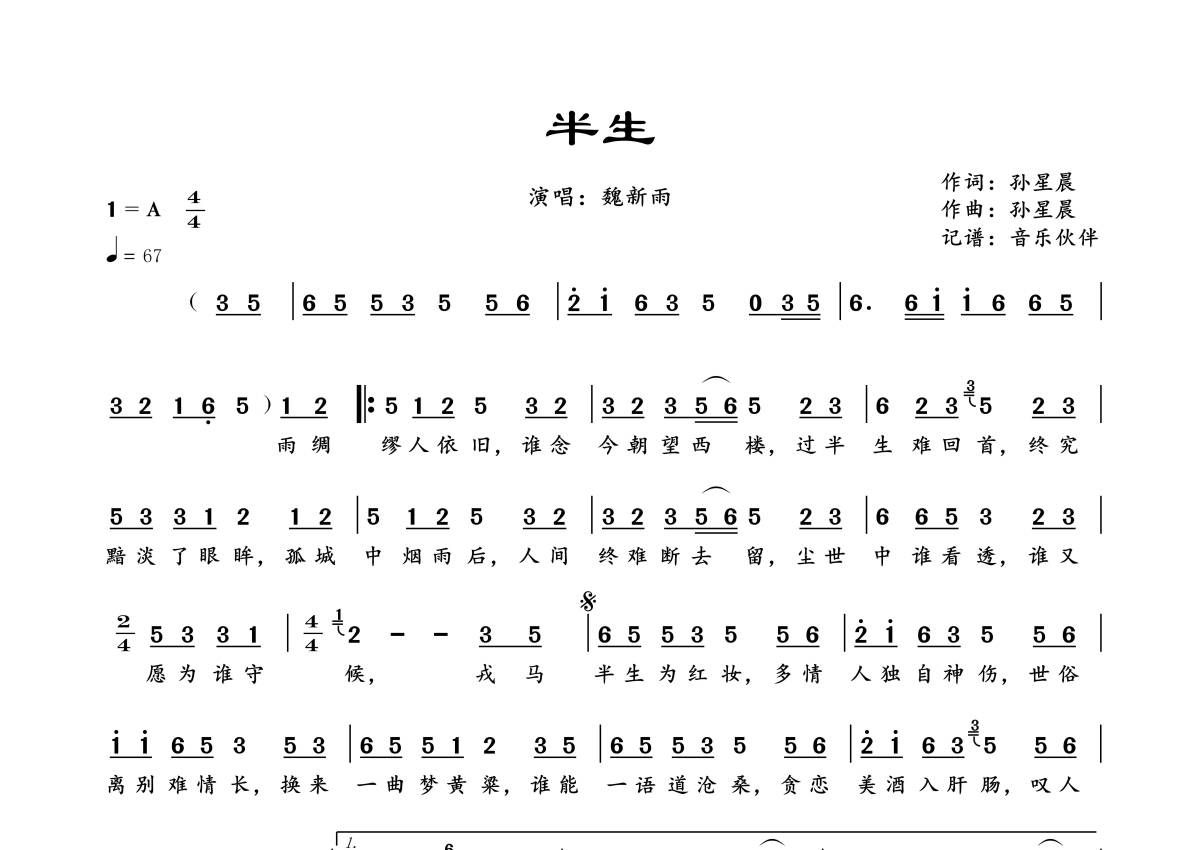 曲谱介绍: 魏新雨《半生》,音乐伙伴编配出品,共有1张高清图谱,免翻页排版设计。