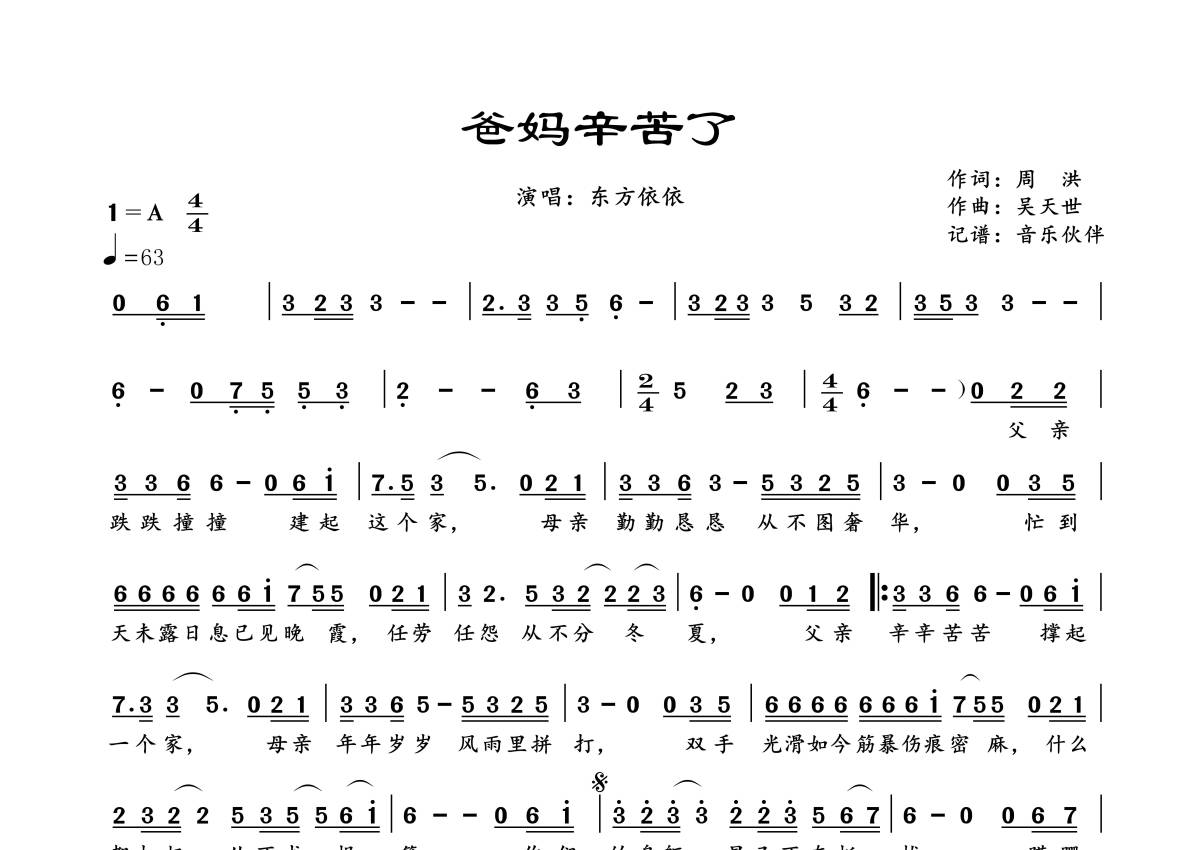曲谱介绍: 东方依依《爸妈辛苦了》,音乐伙伴编配出品,共有1张高清图谱,免翻页排版设计。