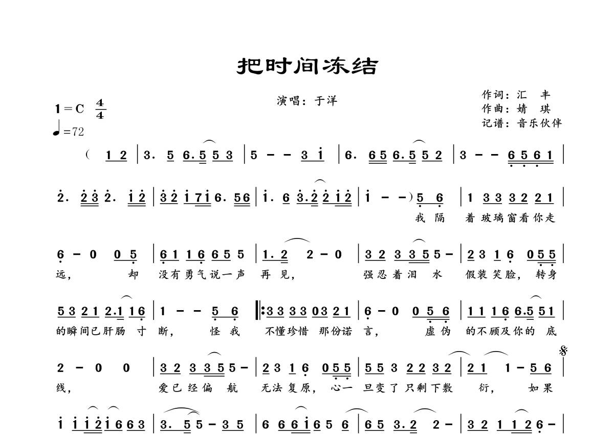 曲谱介绍: 于洋《把时间冻结》,音乐伙伴编配出品,共有1张高清图谱,免翻页排版设计。