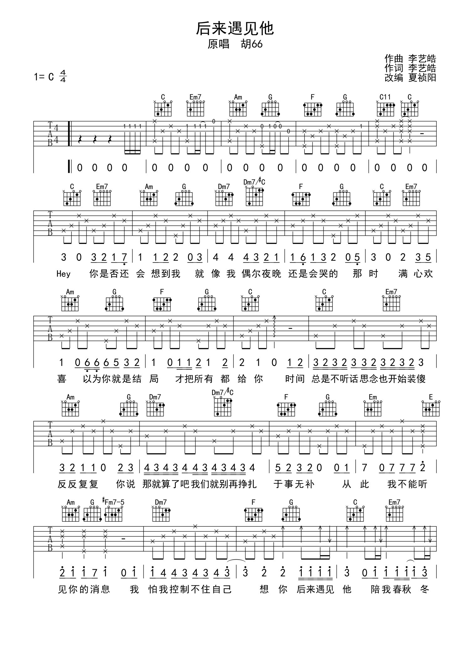曲谱介绍: 胡66《后来遇见他》吉他谱_C调吉他弹唱谱