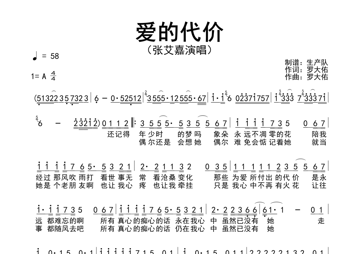 曲谱介绍: 张艾嘉《爱的代价》原版简谱,生产队编配出品,共有1张高清图谱,免翻页排版设计。