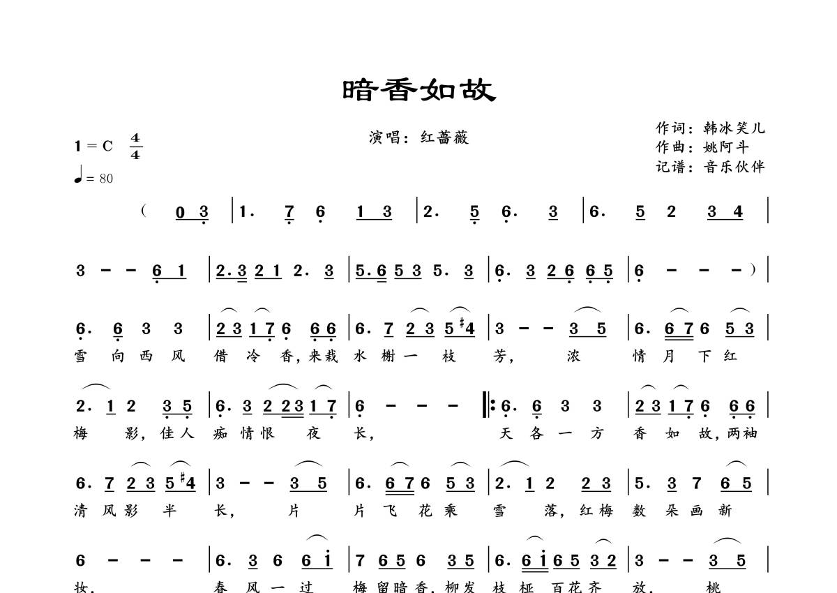 曲谱介绍: 红蔷薇《暗香如故》,音乐伙伴编配出品,共有1张高清图谱,免翻页排版设计。