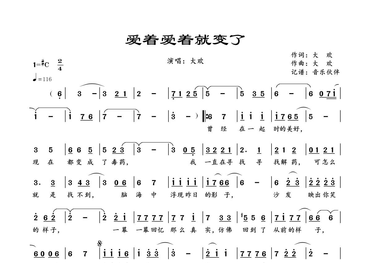 曲谱介绍: 大欢《爱着爱着就变了》,音乐伙伴编配出品,共有1张高清图谱,免翻页排版设计。