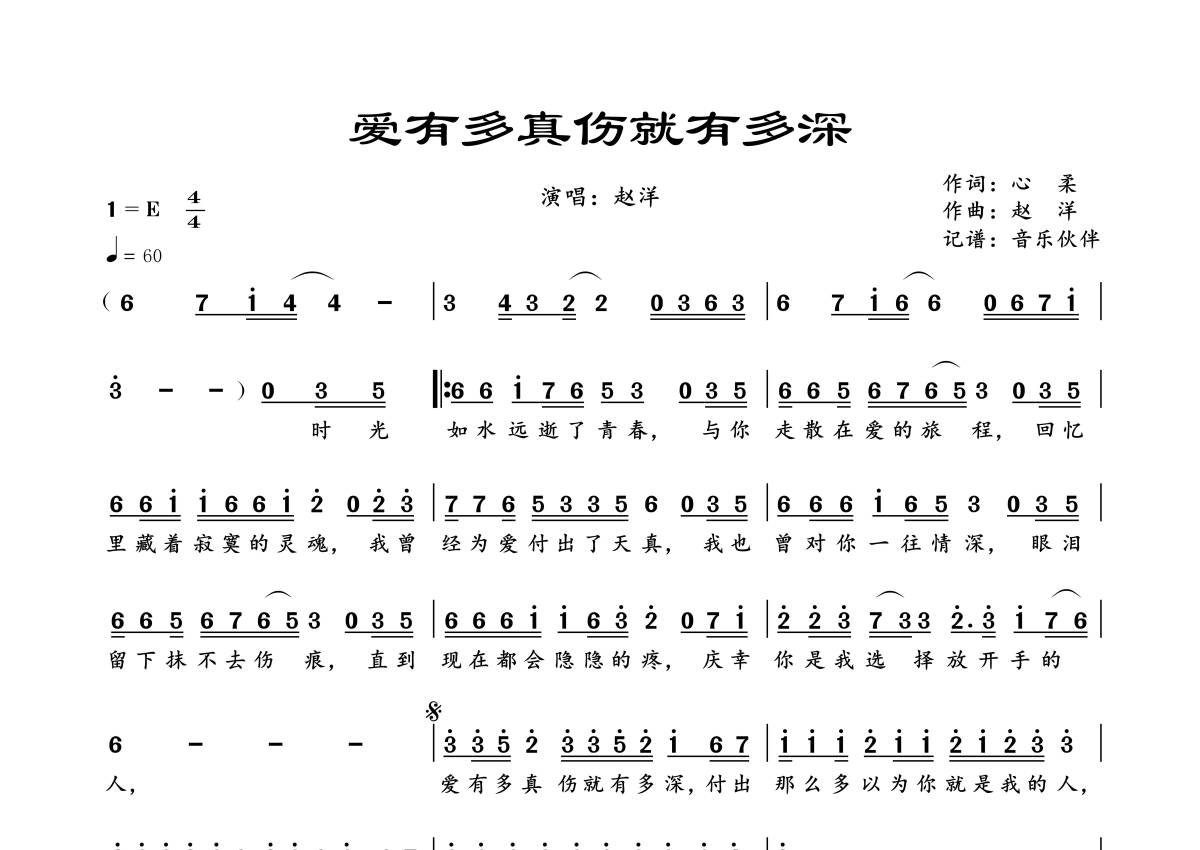 曲谱介绍: 赵洋《爱有多真伤就有多深》,音乐伙伴编配出品,共有1张高清图谱,免翻页排版设计。