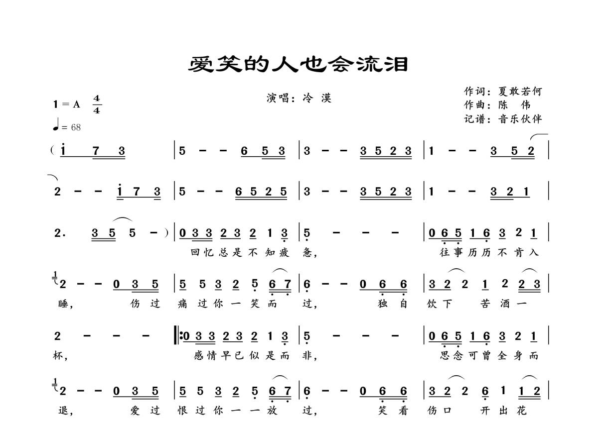 曲谱介绍: 冷漠《爱笑的人也会流泪》,音乐伙伴编配出品,共有1张高清图谱,免翻页排版设计。