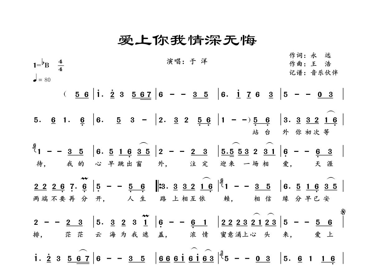 曲谱介绍: 于洋《爱上你我情深无悔》,音乐伙伴编配出品,共有1张高清图谱,免翻页排版设计。