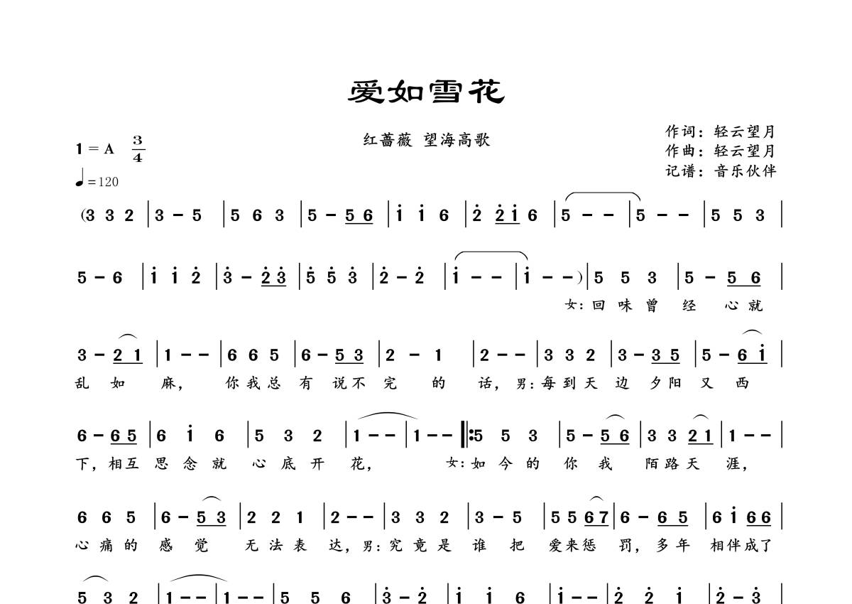 曲谱介绍: 红蔷薇望海高歌《爱如雪花》,音乐伙伴编配出品,共有1张高清图谱,免翻页排版设计。