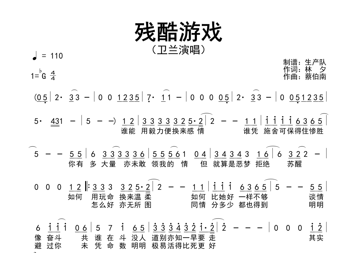 曲谱介绍: 卫兰《残酷游戏》原版简谱,生产队编配出品,共有1张高清图谱,免翻页排版设计。